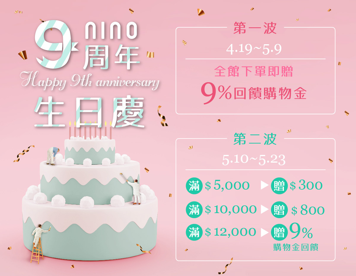 ※9周年生日慶第一波9%回饋購物金,下單後即將於發放至會員帳戶中,無使用效期或使用門檻限制。
