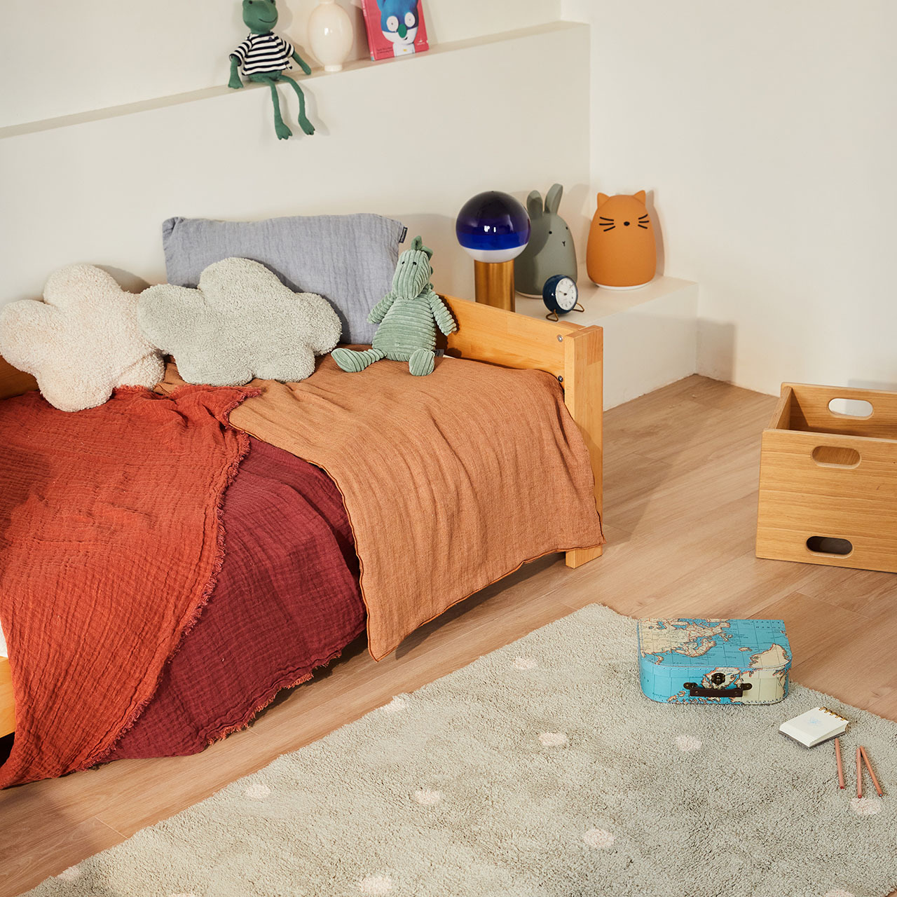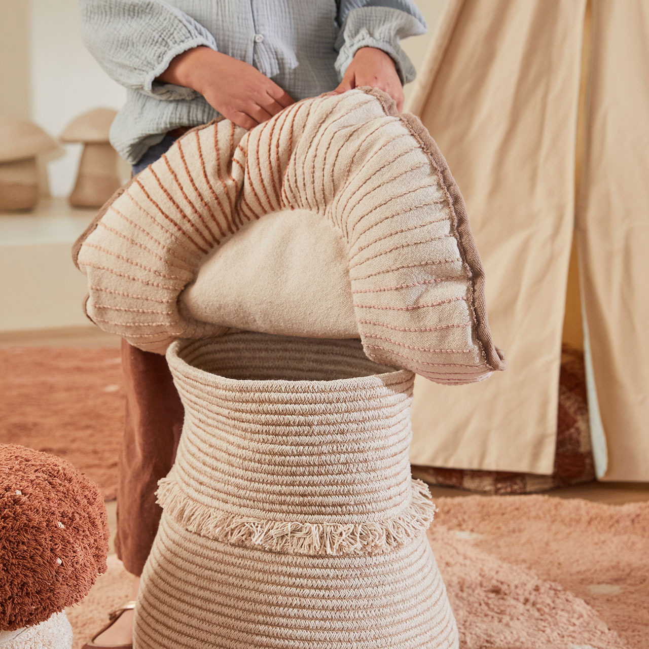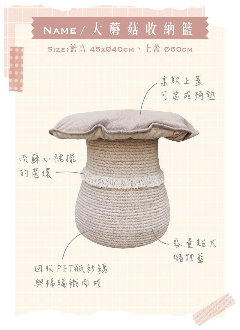 由回收寶特瓶製成的聚酯紗線與棉花混和手工編織而成,除了讓收納籃結構更加堅固、耐用,也同時傳達關愛地球及可持續使用的重要性。