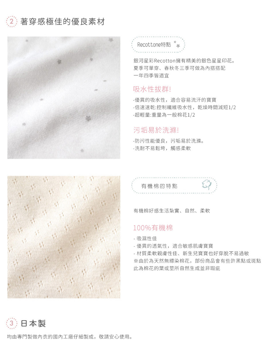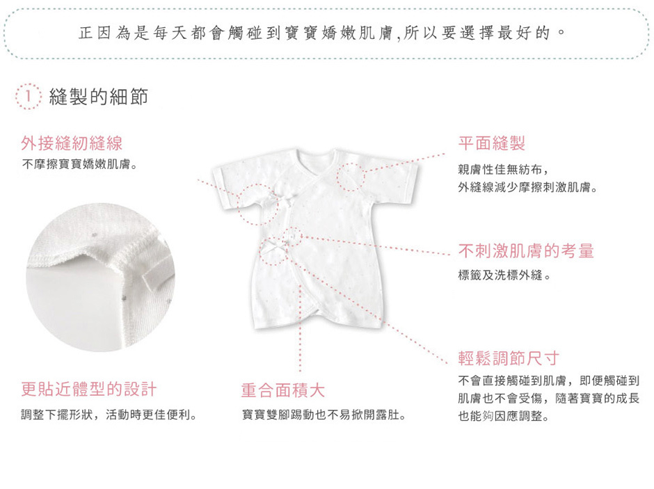 *親膚性佳無紡布,採外接縫紉縫線不摩擦寶寶嬌嫩肌膚 *嚴選純棉高級材質,100%日本製 *褲檔可扣好穿脫、換尿布也方便 *寶寶雙腳踢動也不易掀開露肚