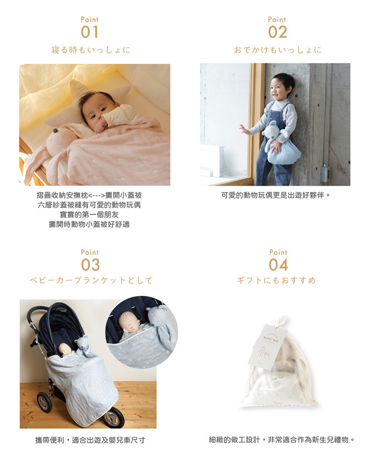 六層紗蓋被縫有可愛的動物玩偶更是出遊好夥伴。