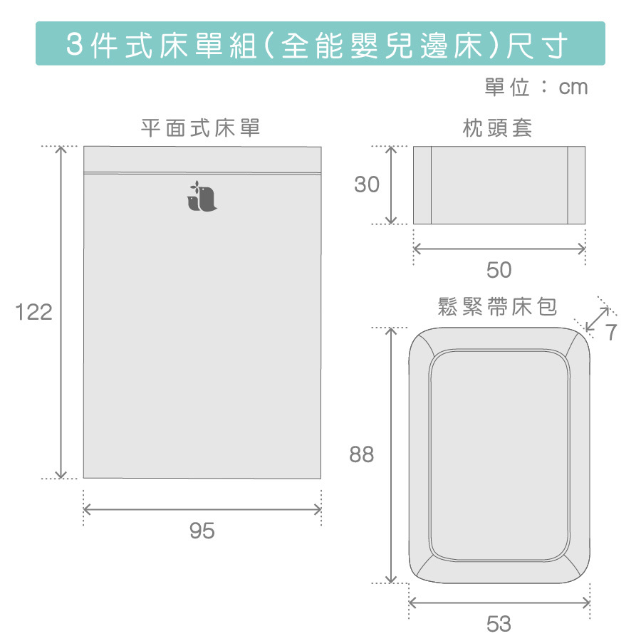 3件式床單組內容物有:鬆緊帶床包、平面式床單、枕頭套