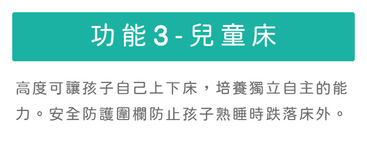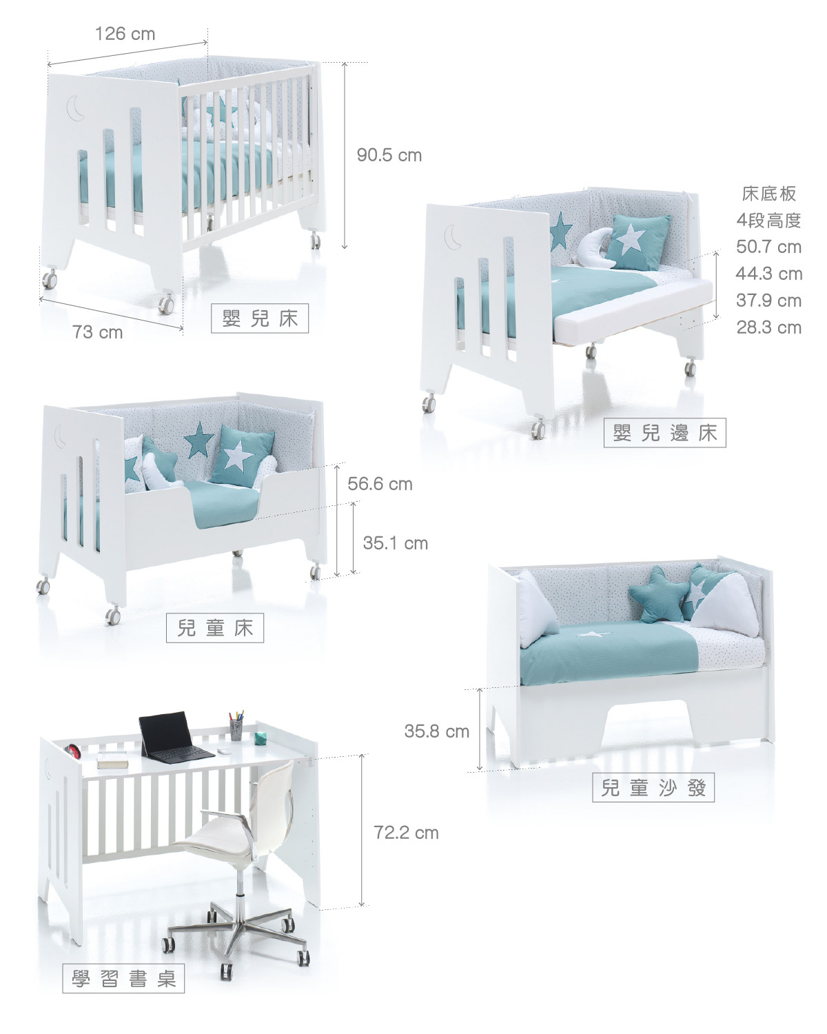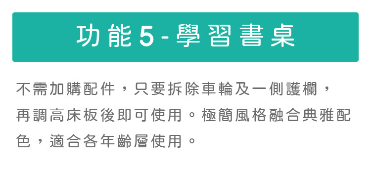 五種功能:嬰兒床、床邊床、兒童床、兒童沙發、書桌