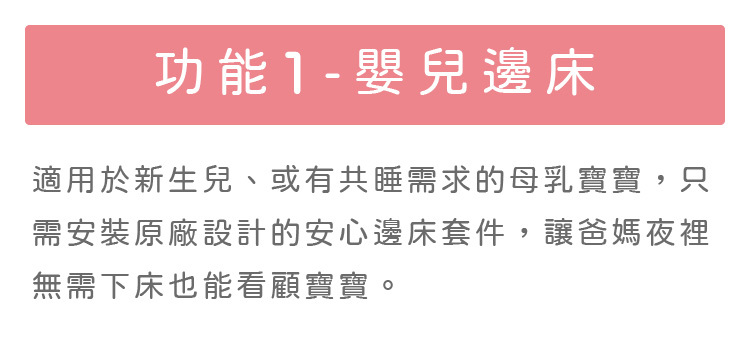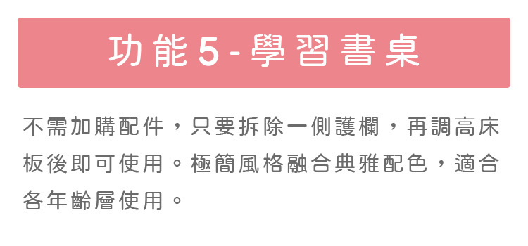 五種功能:嬰兒床、床邊床、兒童床、兒童沙發、書桌