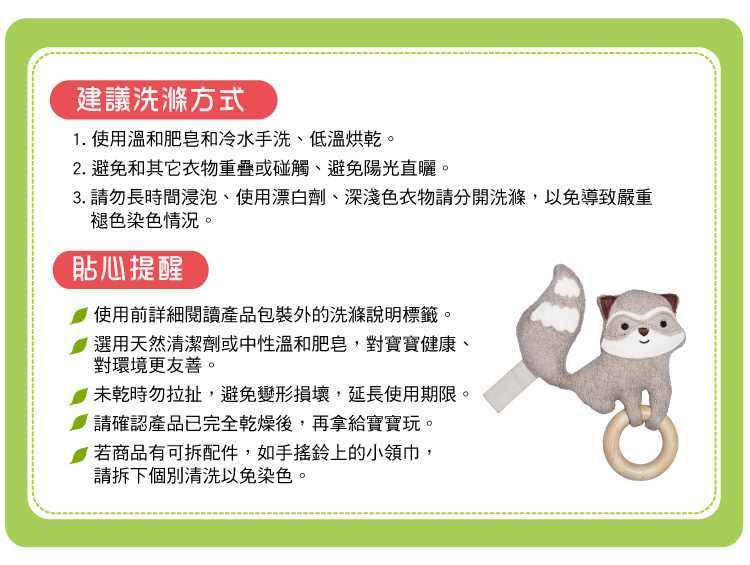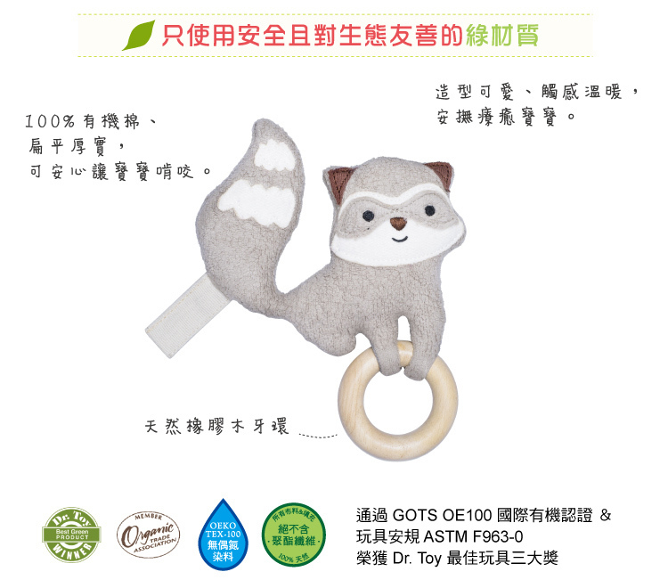 ※ 材質:100%有機棉/填充物:PLA纖維/外表:棉/牙環:橡膠木