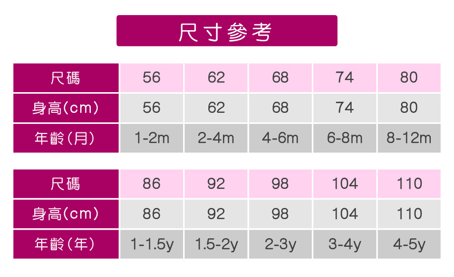 *以上尺寸對照表為建議參考值,仍需視每位孩子的發育成長為主。