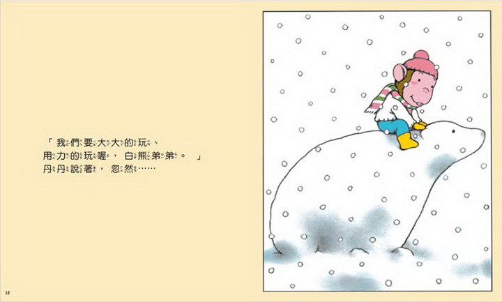 丹丹最喜歡的白熊弟弟,總是輕飄飄的浮在天空中,丹丹一直期待著能跟牠一起玩耍。終於到了寒冷的冬天,白熊弟弟降落下來,丹丹坐在白熊弟弟的背上,往森林走去,準備來一場探險。突然,白色的森林搖搖晃晃的,有妖怪追來了,「跑啊、飛啊,白熊弟弟!」,在丹丹的催促下,白熊弟弟努力的往前跑,也真的飛了起來,丹丹能順利躲過妖怪的攻擊嗎?