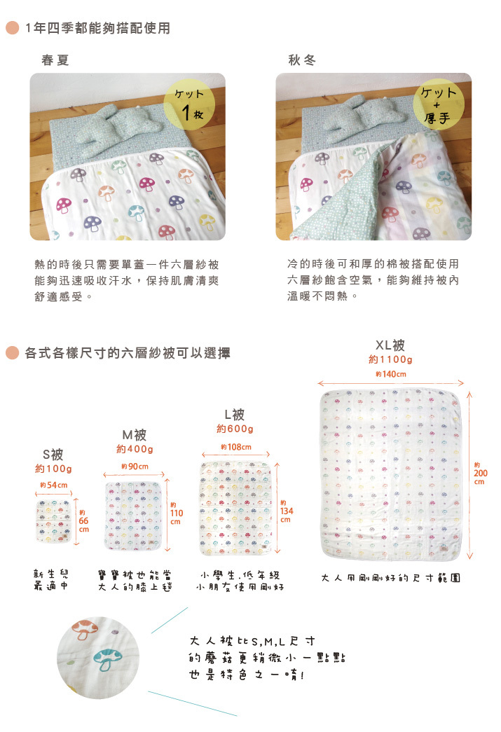 日本最暢銷可愛彩色蘑菇被,六層紗自然形成空氣隔層,保暖透氣並可快速排汗