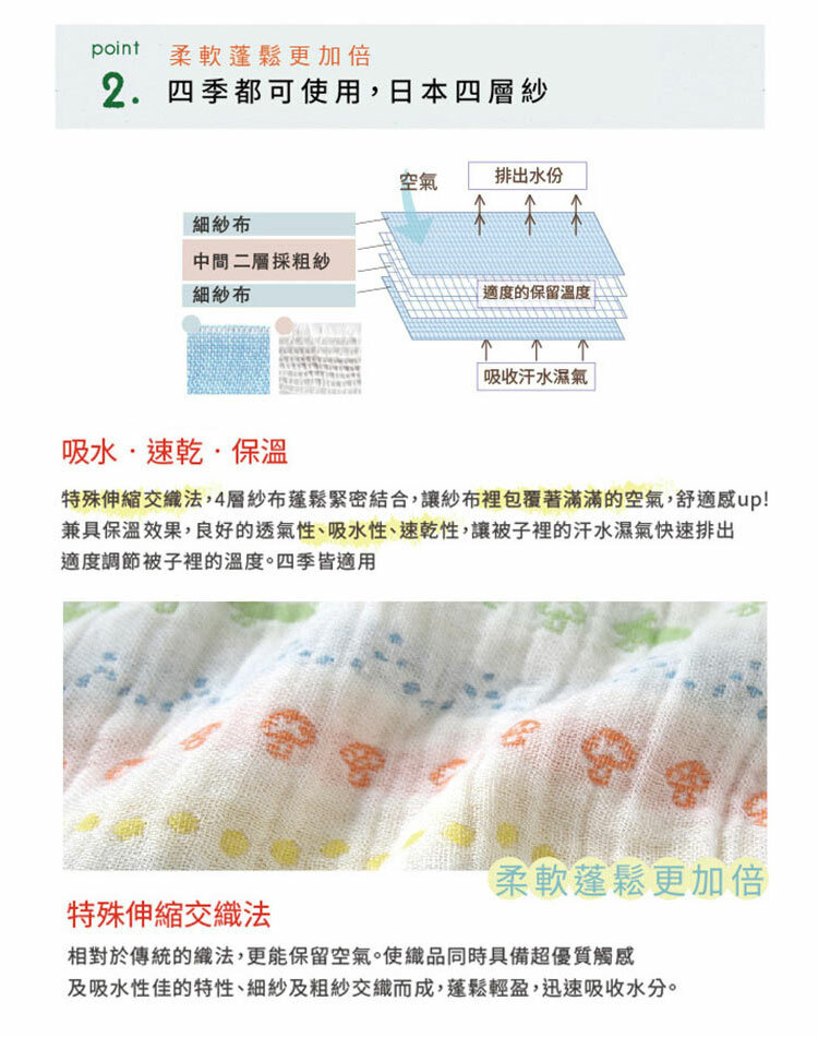 ☆ 特殊伸縮交織法,4層紗布蓬鬆緊密結合