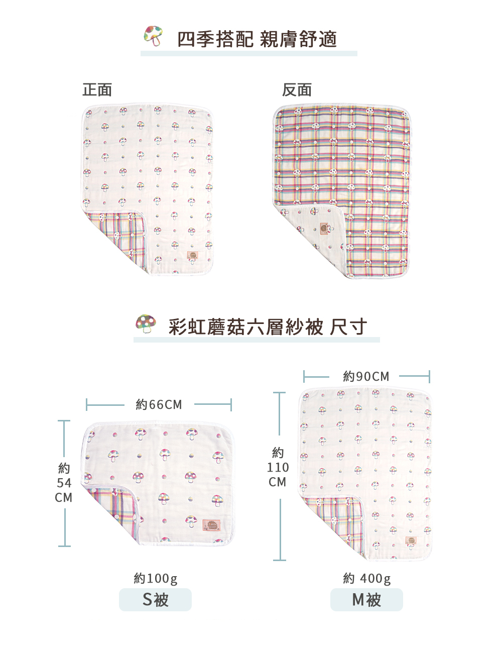 風格不同的兩面設計,正面為繽紛款彩虹蘑菇;背面為格紋蘑菇,