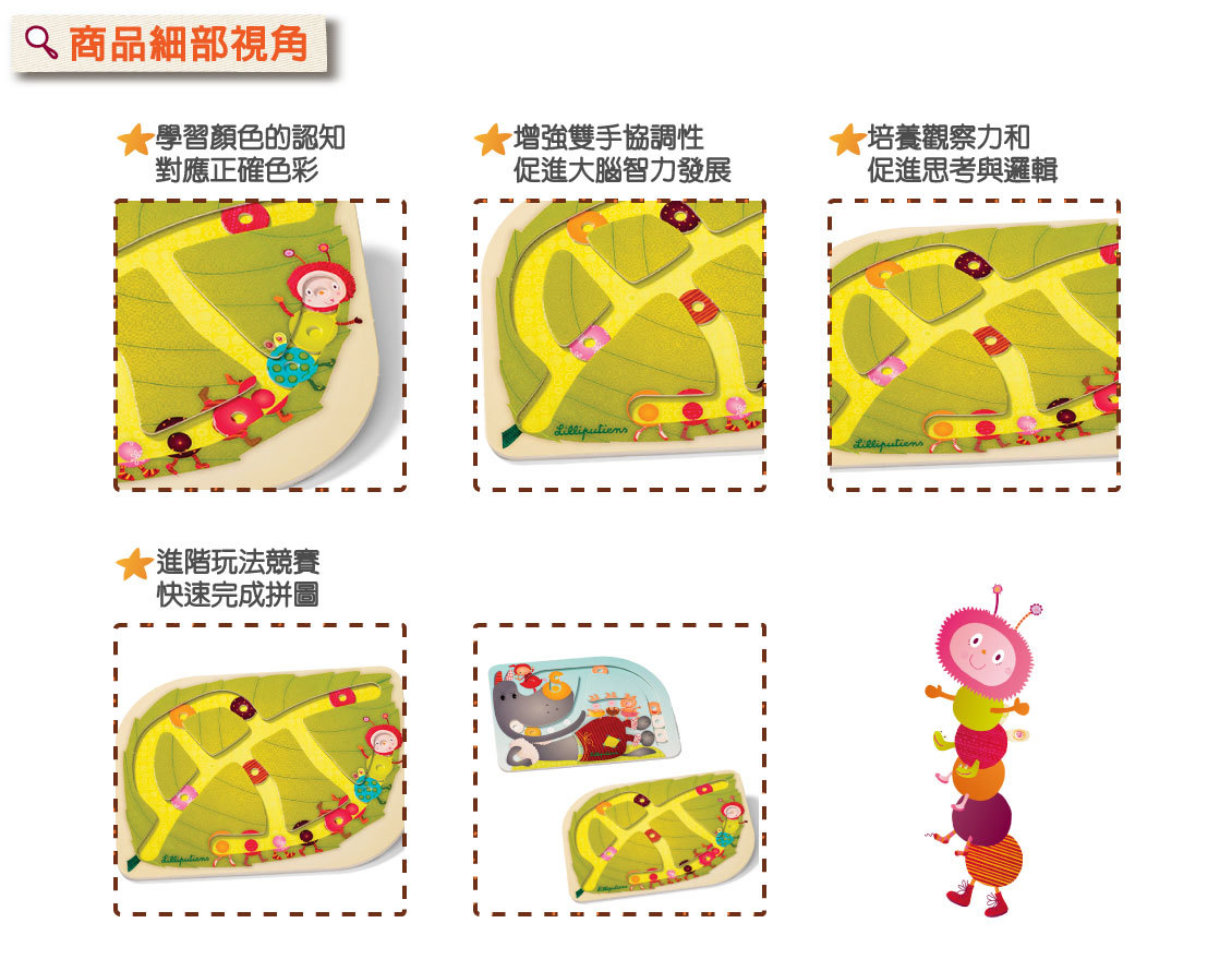 花園的葉子裡,藏著一隻美麗的毛毛蟲,在充滿混亂的拼圖中,