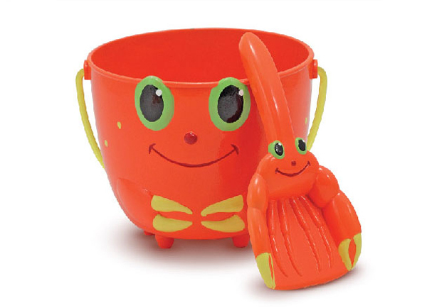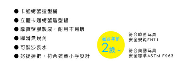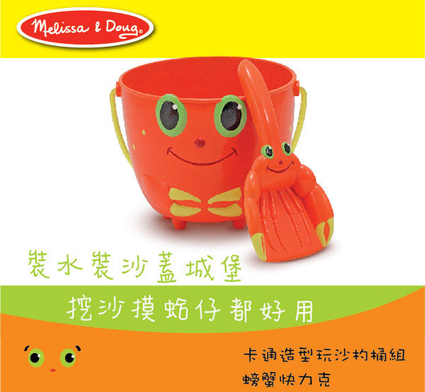 美國瑪莉莎 Melissa & Doug 卡通造型玩沙杓桶組,內附一個蟹形水桶、蟹形鏟子,產品皆圓滑無銳角、厚實材質很耐用,用來裝水裝沙蓋城堡、挖沙摸蛤仔都 OK,裝些小魚小蝦也難不倒它!給你跟寶貝 2 倍的快樂滿足!