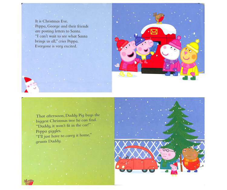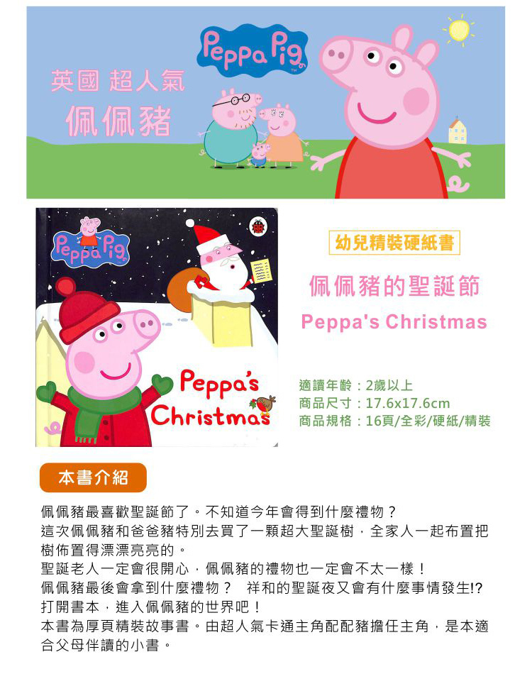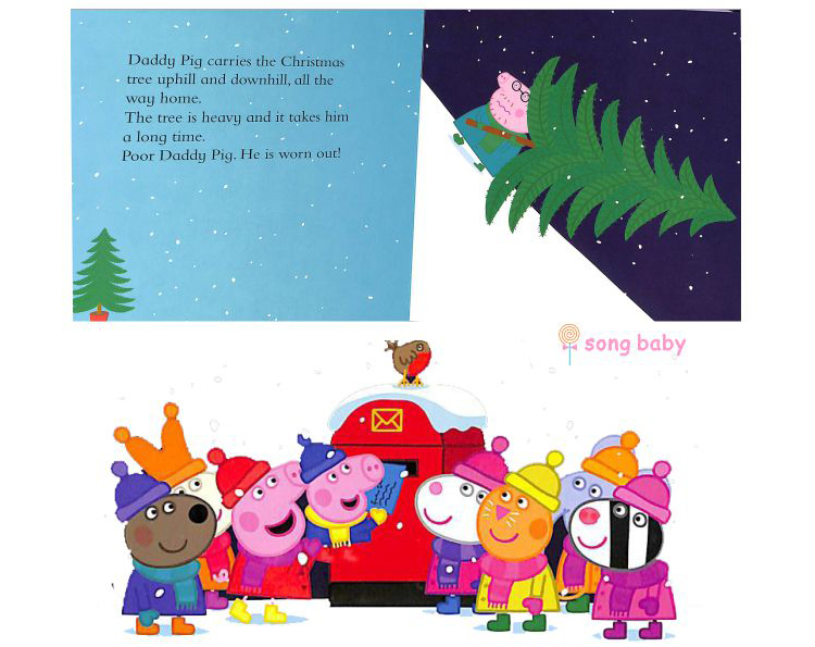 佩佩豬和家人們正在準備著耶誕節的佈置。此時,家裡來了一位訪客,快翻開故事書一起來看看發生了什麼事情吧!