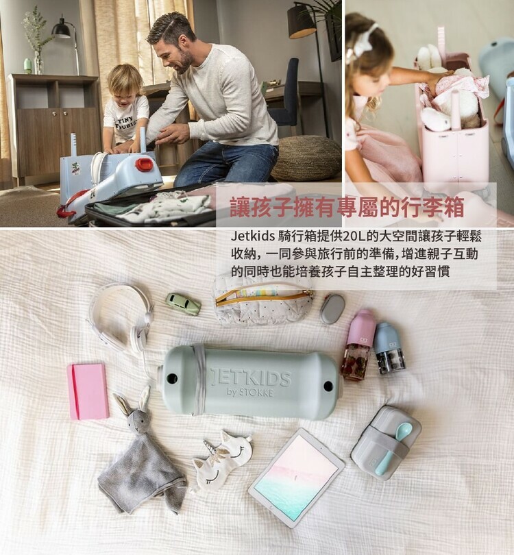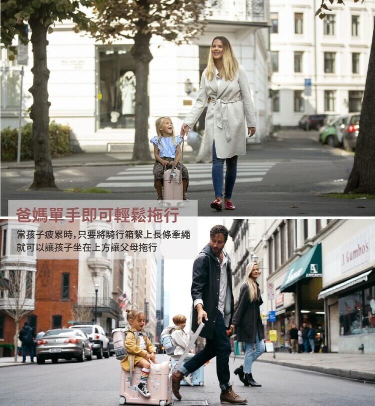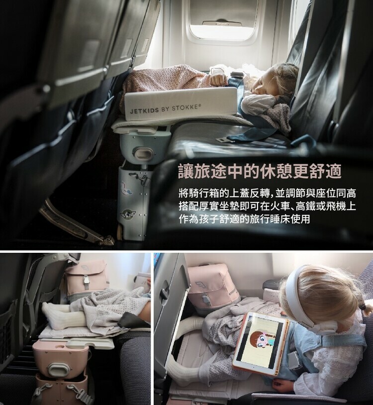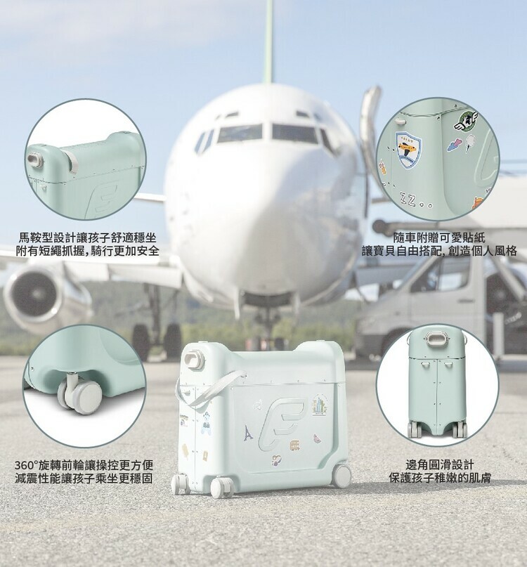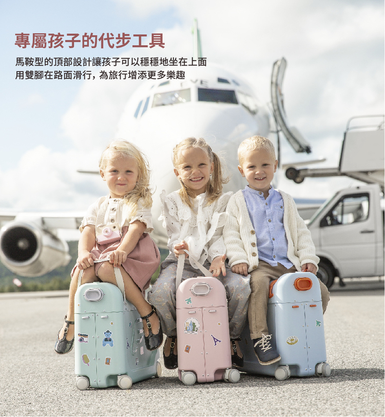 Jetkids 為兒童設計了專屬的騎乘式行李箱,可自行滑行也可讓爸媽協助拖行。經過多次改良設計,Jetkids騎行箱更增加了睡眠輔助的功能,讓孩子可以在火車、高鐵或飛機上擁有舒適的睡眠。