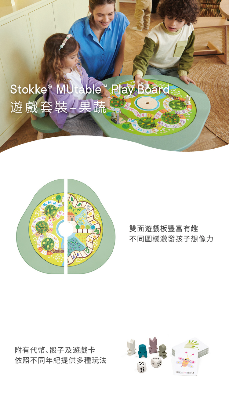 雙面遊戲板,多種圖樣激發兒童思考與想像力,搭配內附的代幣、骰子及遊戲卡,為不同年紀的孩子提供不同難易度的遊戲。