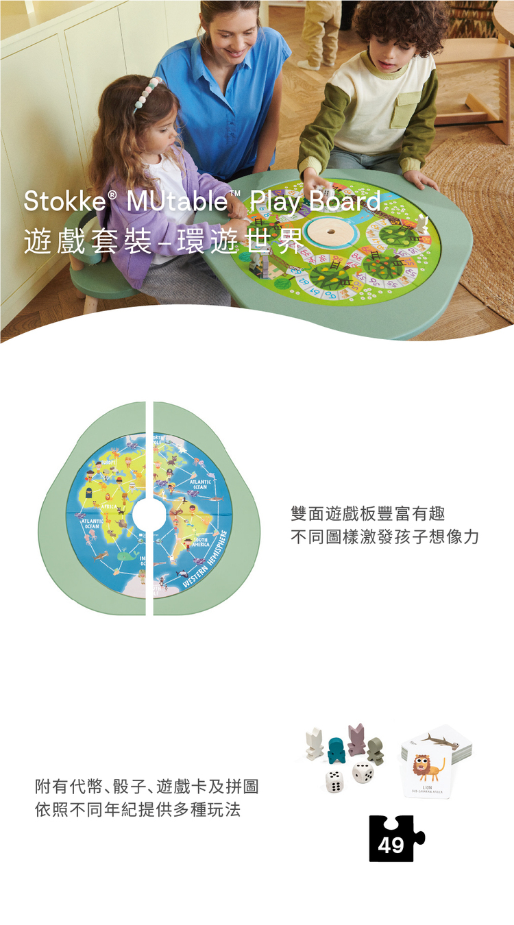 雙面遊戲板,多種圖樣激發兒童思考與想像力,搭配內附的代幣、骰子及遊戲卡,為不同年紀的孩子提供不同難易度的遊戲。