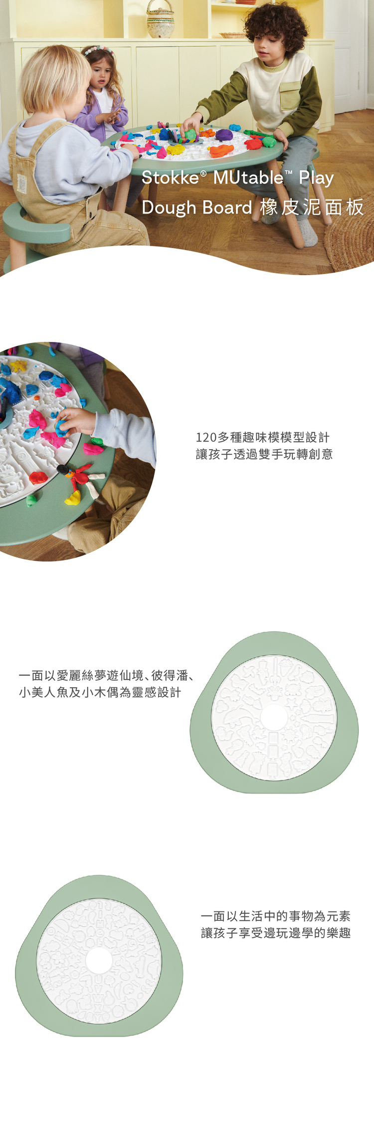 雙面黏土板其中一面靈感來自 4 個童話,包括小飛俠、愛麗絲夢游仙境、小美人魚及小木偶,